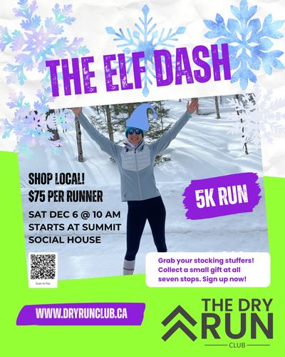 Join the Dry Run Club for the Elf Dash on Saturday, December 6, 2025 — a 5KM holiday fun run (or walk) through downtown Collingwood shaped like a Christmas stocking! A small gift awaits you at every stop.